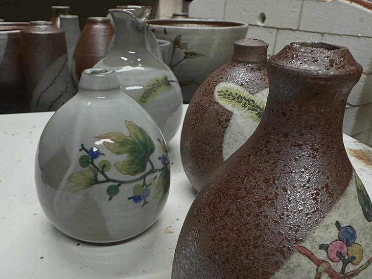 大宇陀の野草花が描かれた器と約200種の陶器ボタン。町家の陶芸工房